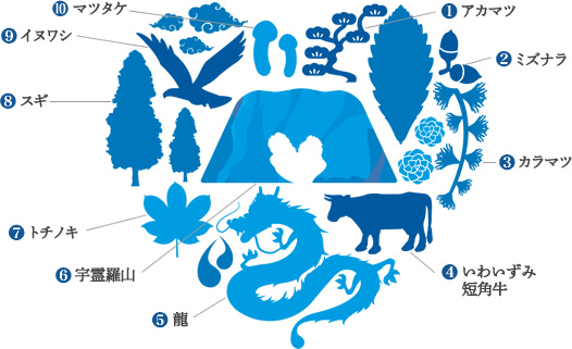 龍泉洞をイメージしたブルーを基調に、岩泉を代表するモチーフが盛り込まれています。松茸や短角牛といった特産品、岩泉の森に生息するイヌワシ、町木であるアカマツ、そして森を彩る多様な樹種(ナラ、トチ、スギ、カラマツ)。龍は龍泉洞にまつわる伝説とともに、太平洋へと注ぐ川の流れも表しています。
