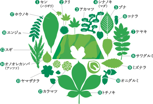 投票で選ばれた、岩泉を代表する17種類の木で、多様性に富んだ森づくりを示しています。3種の針葉樹(アカマツ、カラマツ、スギ)と14種の広葉樹(ミズナラ、コナラ、トチノキ、ホウノキ、ブナ、セン(ハリギリ)、クリ、オニグルミ、サワグルミ、シナノキ(マダ)、ケヤキ、オノオレカンバ(アンツァ)、ヤマザクラ、エンジュ)。あなたはいくつ知っていますか?