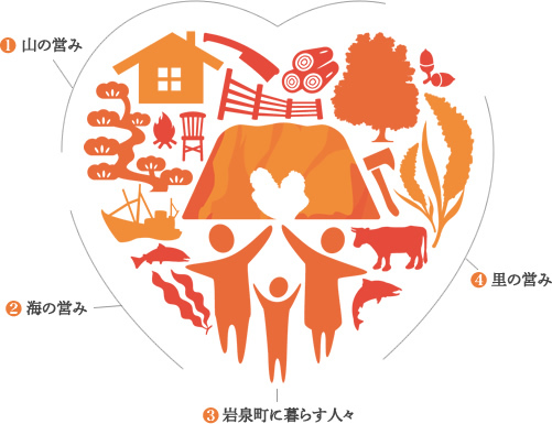 森の恵みから広がる、岩泉の人たちのさまざまな営みを表しています。木材は家や家具、燃料に。はせ(稲架)などの農業資材としても利用されます。森の養分は地域の田畑を潤し、最後は海に流れ込み、海藻や魚を育てます。林業、農業、漁業を中心とした、私たちの暮らし。そのすべての源は、森にありました。
