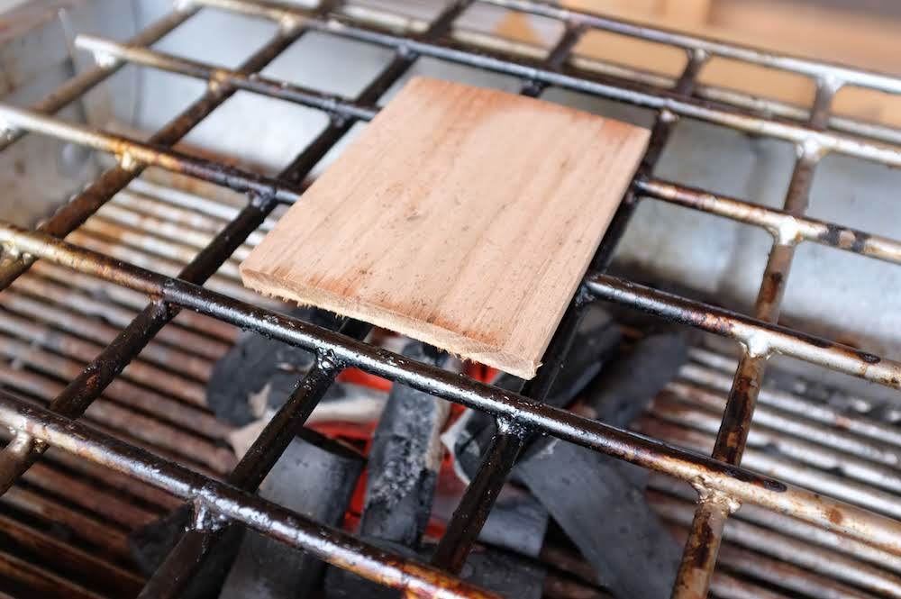 BBQコンロで炭をおこして、あらかじめ水につけておいたウッドプランクを網の上にのせ、煙が出てくるまでしばらく放置します。