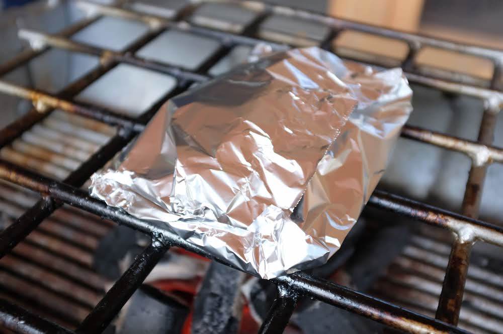 食材によく火が通るように、グリルの蓋をかぶせるか、なければアルミホイルで包みます。