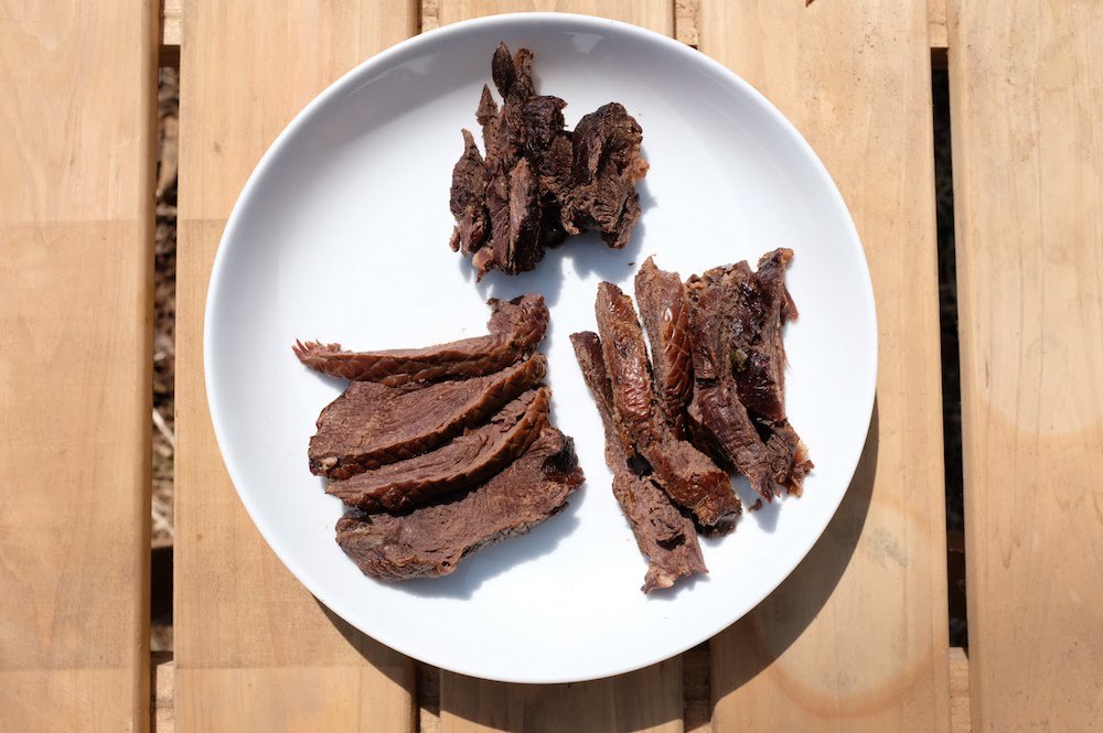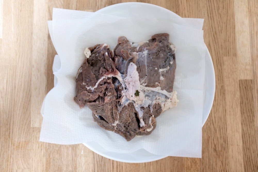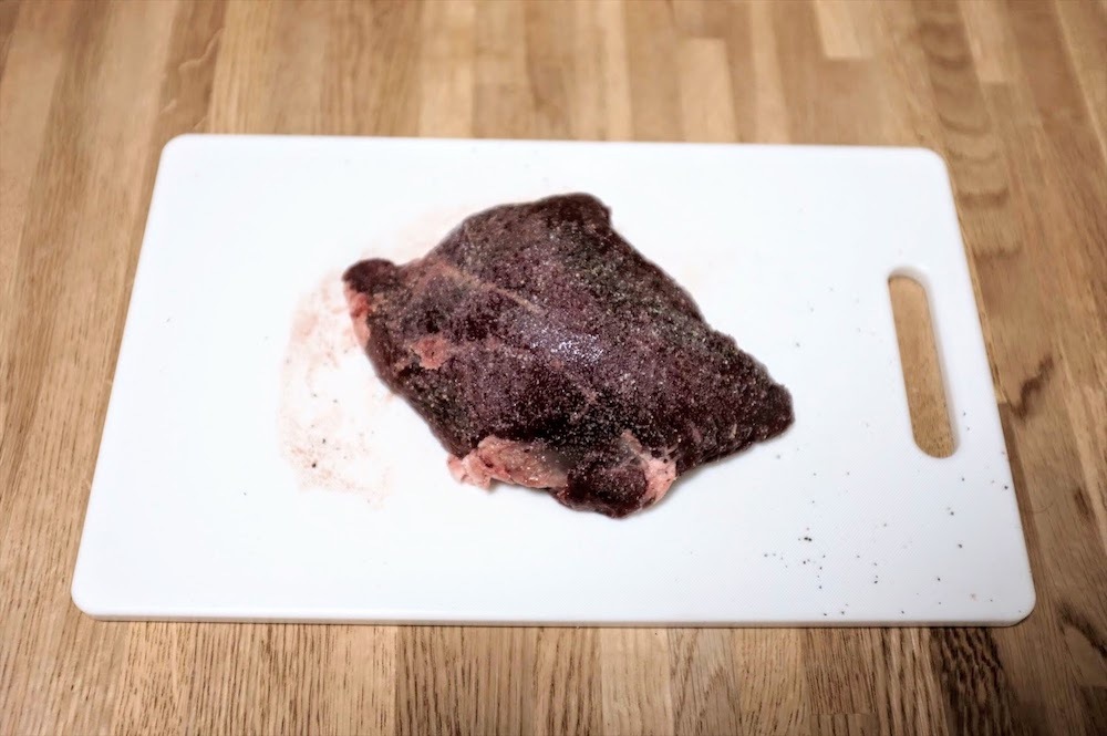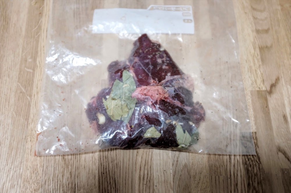 鹿肉を300g程度のものを用意する。下ごしらえに塩とブラックペッパーを満遍なくふりかけ揉み込む。この後1週間ほど寝かせるため揉み込む際は手袋を使い雑菌ができるだけつかないように。
