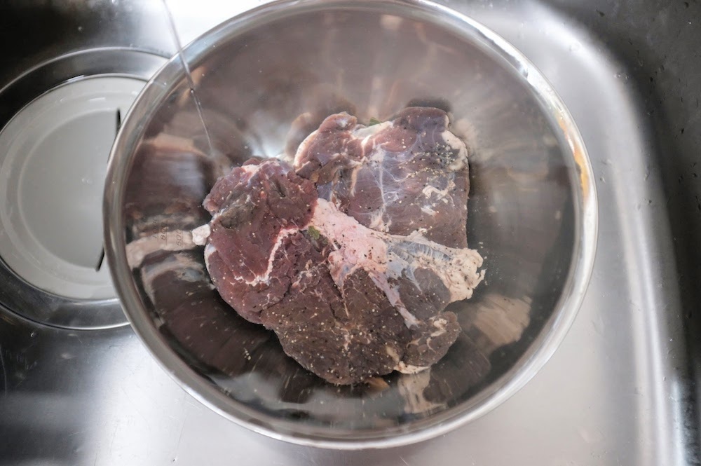 1週間後、冷蔵庫から取り出し、流水に浸して塩抜きを行う。塩抜きの目安は5時間程度。燻製するので少々塩が抜けすぎているくらいの方が食べやすい。