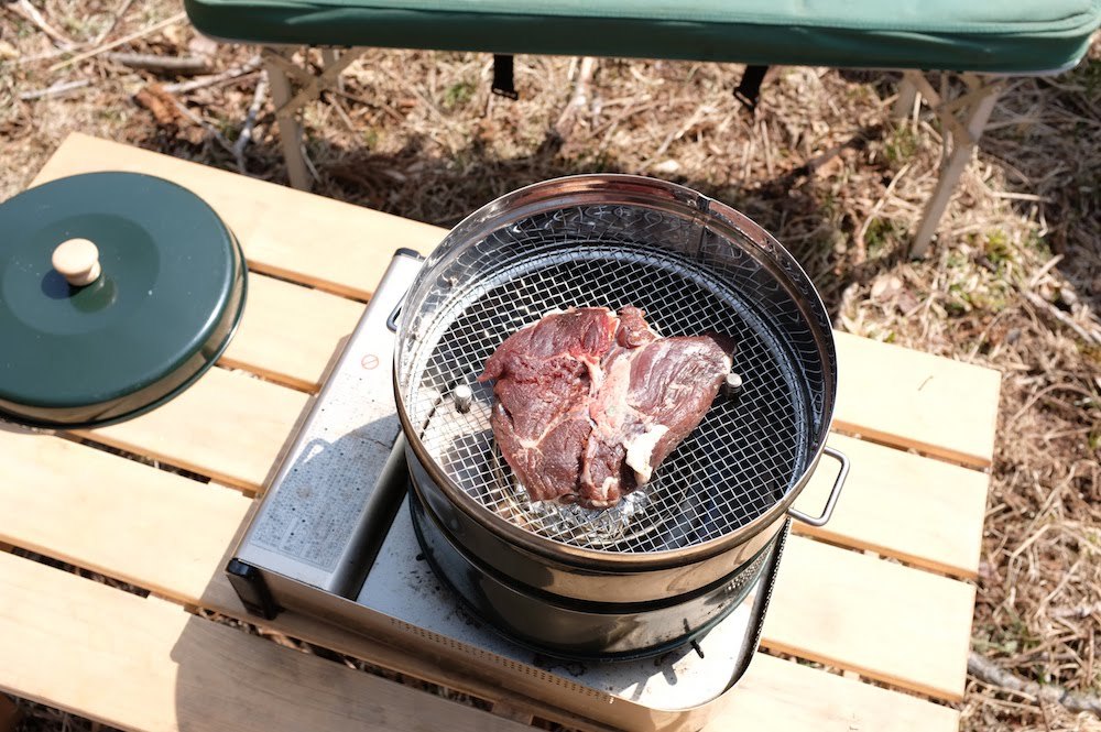 燻製器にサクラのスモークチップをセットし、網に上に鹿肉をのせ強火で加熱する。煙が出たら中火にして蓋をし40分燻す。