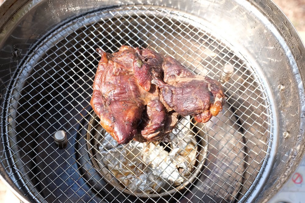40分後、蓋をとり燻製具合を確認する。こんがりとした色になり、大きさもだいぶ小さくなった。串をさしてみて中まで熱が通って入ればOK!
