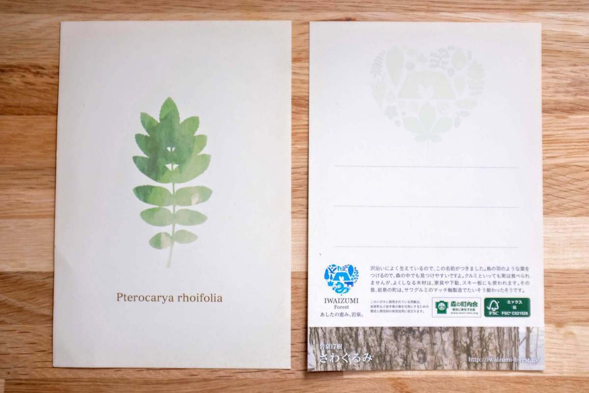 ®️ミックス紙を使用。表面には樹種ごとに葉っぱや木の実のイラストと学名を表記、裏面には樹種ごとの特徴や岩泉での暮らしとの関わりが説明されています。