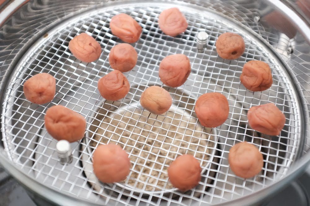 燻製器にナラのスモークチップをセットし、網の上に梅干しをのせる。強火で加熱し煙が出てきたら中火にし蓋をする。