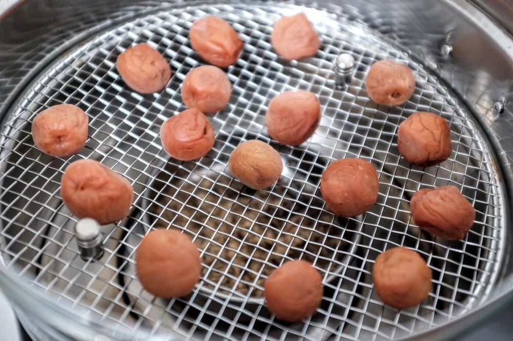10分後、蓋を開け燻製具合を確認する。梅干しの場合色はほとんど変わらないので、ひとつ食べてみて燻製の味が染み込んで入ればOK!