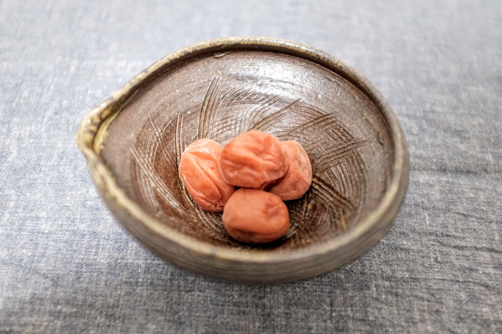 梅干しを1パック分用意する。しそ漬けでもはちみつ漬けの2種類あれば2倍楽しめる。